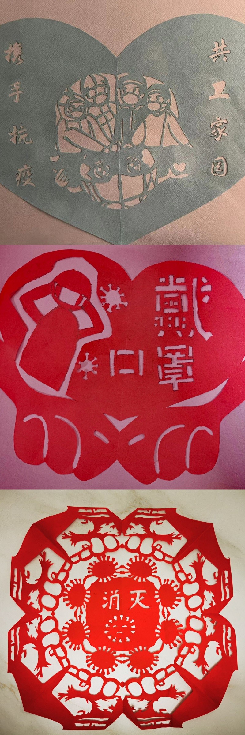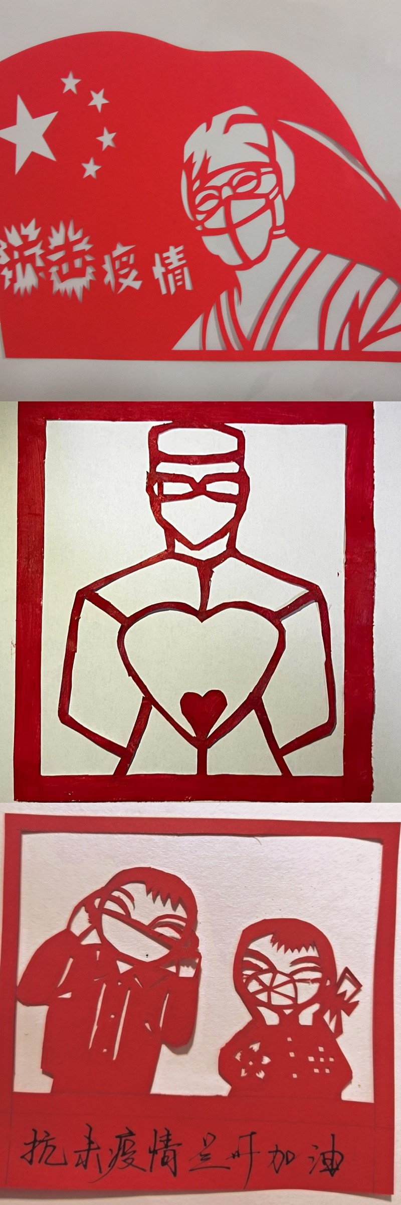 廣大職工將剪紙藝術與疫情防控知識巧妙結合,指尖飛旋,刀起紙落,將自己的所思所想融進一張張薄紙,將疫情防控的感人場面轉化成一幅幅生動的作品,為打贏疫情防控戰加油打氣,為防控疫情盡一份自己的微薄之力。
