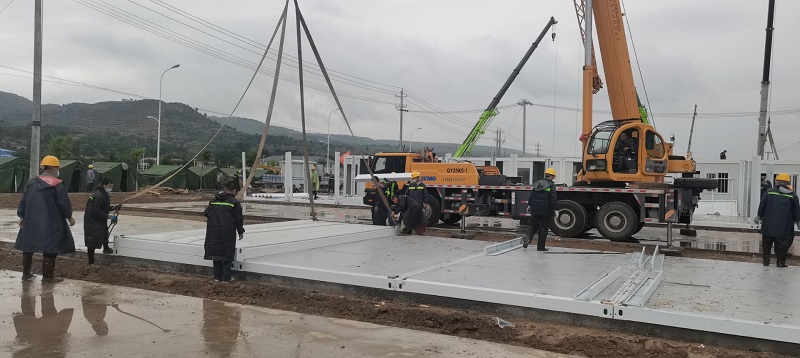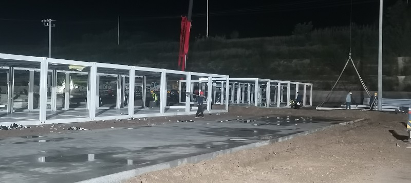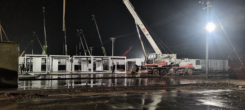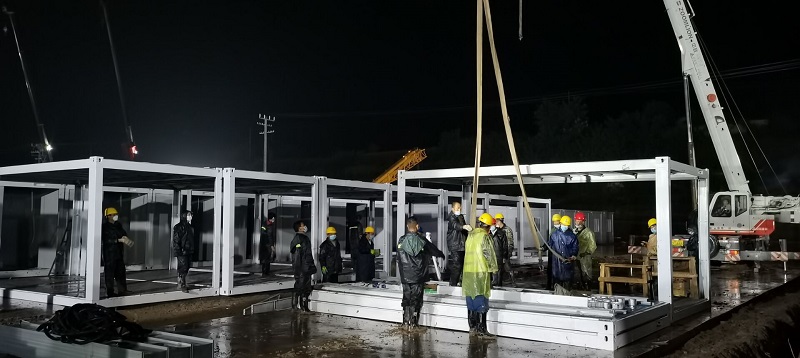 因疫情和連續降雨天氣,給施工造成一定困難,項目部全體人員風雨里、泥濘中拼搏共進,分秒必爭,加快“逆行”腳步,顧不得休息,24小時不間斷輪班施工,全力以赴,統籌協調人力、物力、機械。截至目前已完成100間集裝箱的框架安裝和40套墻板安裝任務,衛浴設施及水電也在緊張施工過程中,剩余未完成工程量的材料已全部發貨,其他要素正逐項配齊。