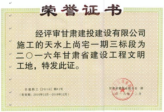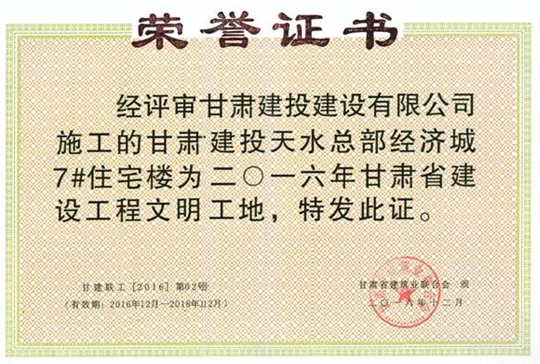 公司2015年度被中共甘肅建投建設(shè)有限公司黨委評(píng)為“先進(jìn)黨支部”榮譽(yù)稱號(hào),2016年度被甘肅建投建設(shè)有限公司評(píng)為“先進(jìn)集體”榮譽(yù)稱號(hào)。天水總部經(jīng)濟(jì)城7#樓、天水上尚宅5#、9#樓被評(píng)為省級(jí)安全文明工地,中海河山郡二期23#、27#樓及相連地下車(chē)庫(kù)工程被評(píng)為“建設(shè)杯”二等獎(jiǎng),長(zhǎng)城工程技術(shù)中心項(xiàng)目榮獲“麥積獎(jiǎng)”“飛天獎(jiǎng)”,長(zhǎng)城電工中壓氣體絕緣廠房項(xiàng)目“大面積耐磨地坪結(jié)合鋼釬維混凝土施工”獲得省級(jí)工法。