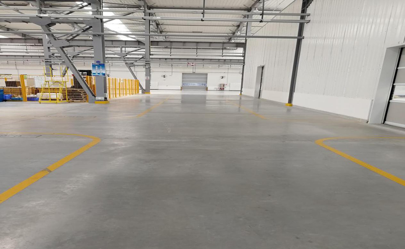 該工程中應用了鋼纖維混凝土,通過在混凝土中摻入一定數量的鋼纖維,提高了混凝土的抗壓、抗拉、抗彎,抗裂及抗疲勞、韌性等性能。面層耐磨粉與混凝土整體凝固而成,其中摻入的骨料硬度極高,有效提高地坪的耐磨、抗沖擊、抗壓性能,延長了地坪使用壽命。