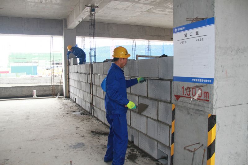 隨后的比賽中,對(duì)全體參賽選手進(jìn)行質(zhì)量交底和安全交底后依次進(jìn)行了理論考試和實(shí)作競(jìng)賽。現(xiàn)場(chǎng)切割機(jī)長(zhǎng)鳴,敲打聲此起彼伏,運(yùn)送著砂漿的拉斗車在飛快穿梭,被熟練操縱的砌磚刀有序地?fù)]舞著,一次次放線、測(cè)量,一次次抹灰、敲打,奏響了速度與質(zhì)量的壯美交響樂。此次競(jìng)賽的砌體水平灰縫厚度及豎向灰縫寬度均為15毫米內(nèi),正、反面墻面均宜進(jìn)行勾縫,對(duì)參賽選手的起評(píng)分提到了一個(gè)新高度。也不見砌筑中常見的吊線錘,選手都是自帶激光水平儀,現(xiàn)場(chǎng)上紅線、綠線縱橫交織,感覺又現(xiàn)代又高級(jí),充分展現(xiàn)了競(jìng)賽推動(dòng)建設(shè)知識(shí)型、技能型、創(chuàng)新型勞動(dòng)者大軍,弘揚(yáng)勞模精神和工匠精神的活動(dòng)內(nèi)涵。