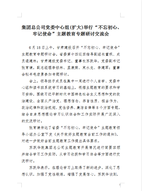 【不忘初心 牢記使命】集團總公司黨委中心組(擴大)舉行“不忘初心、牢記使命”主題教育專題研討交流會